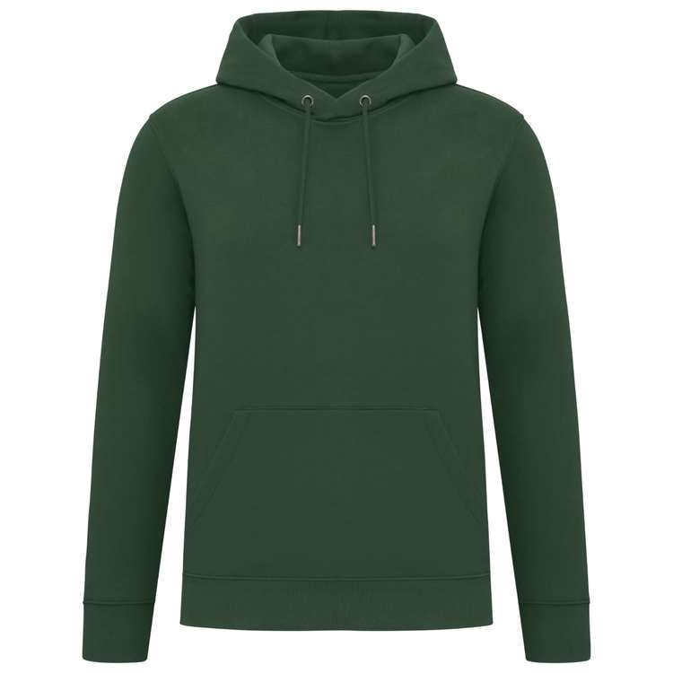 Ce sweat-shirt à capuche unisexe est fabriqué à partir de coton biologique majoritaire et de polyester recyclé post consumer. La matière est assemblée en construction 3 fils LSF, ce qui limite le rétrécissement au lavage et stabilise le vêtement dans le temps. Le tissu affiche un grammage de 350 g/m², avec une face intérieure en molleton gratté pour l’isolation thermique et une face extérieure en coton peigné adaptée à l’impression. La capuche est doublée et équipée d’un cordon rond avec embouts en métal recyclé. Une poche kangourou est intégrée à l’avant. Le sweat est proposé du XXS au 4XL. Il est certifié OEKO TEX, EVE VEGAN et Ecocert.