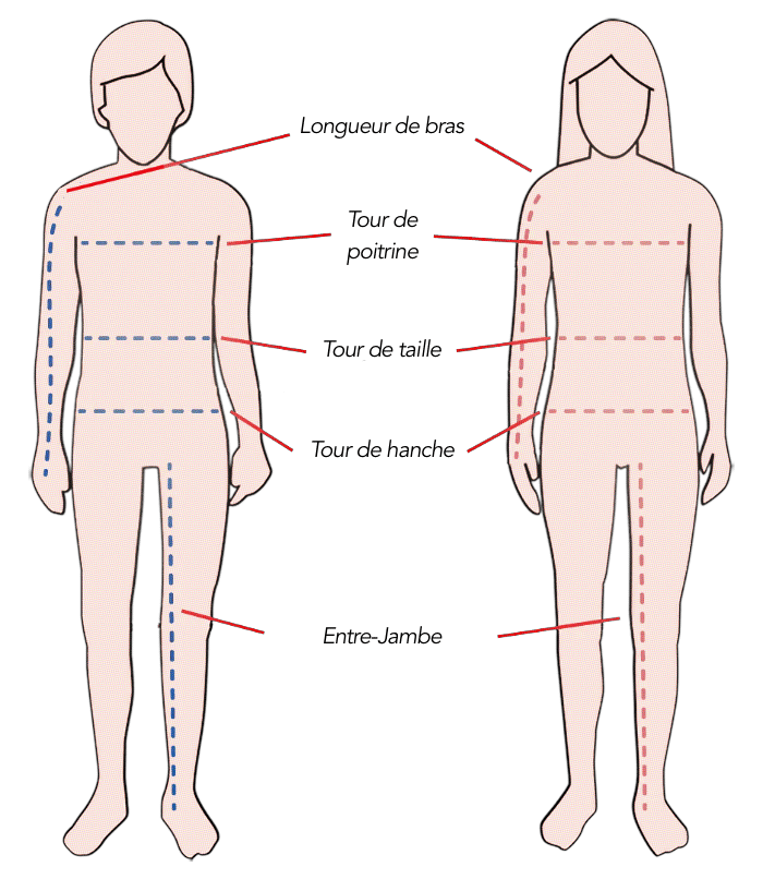 Pour choisir la bonne taille, il est essentiel de prendre vos mesures correctement. Effectuez ces mesures en sous-vêtements ou avec des vêtements ajustés pour éviter toute marge d’erreur. Si vos mesures tombent entre deux tailles, nous vous recommandons de choisir la taille au-dessus pour un meilleur confort.
