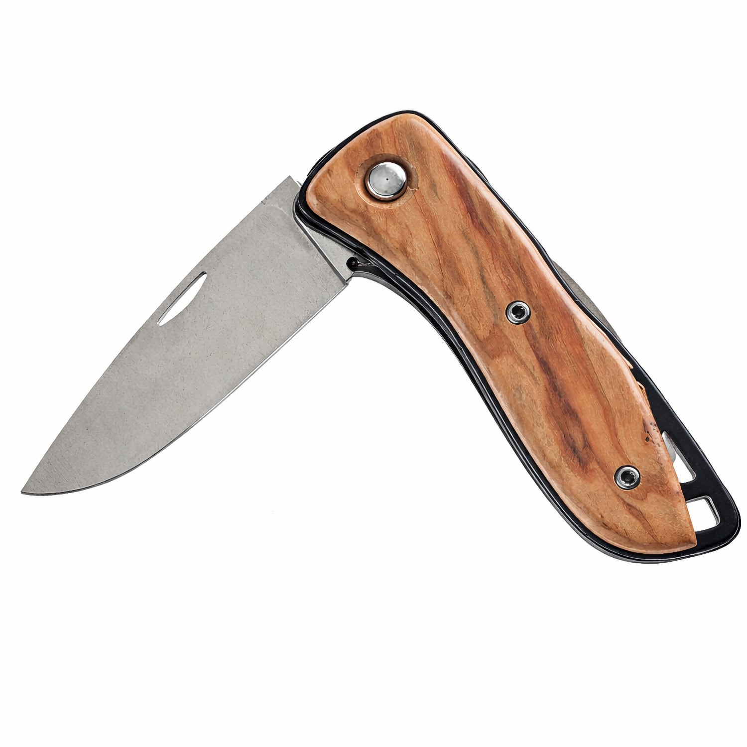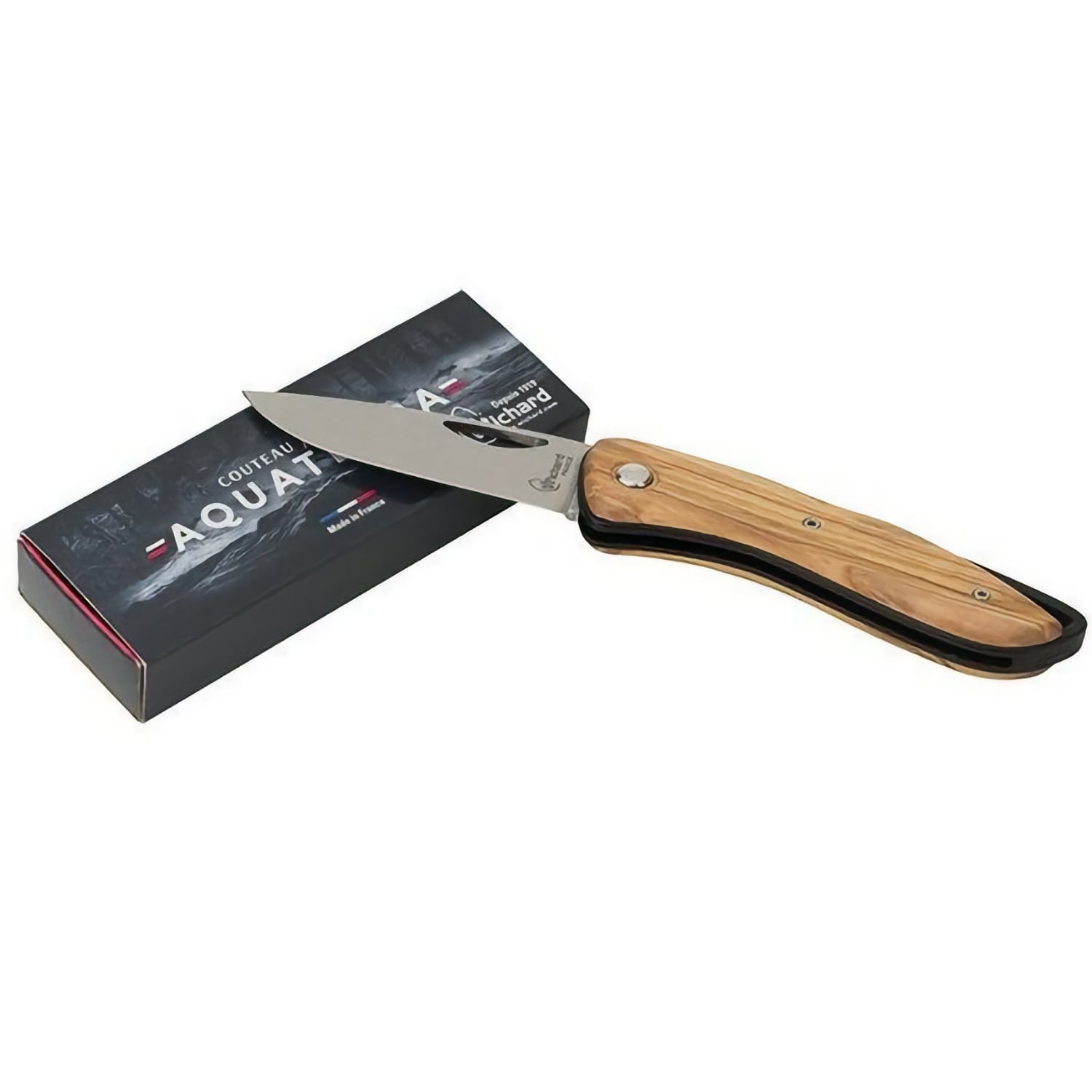 Le couteau Aquaterra à lame simple lisse avec un manche en bois d'olivier d'origine France - platines en fibres d'aramide est destiné aux activités nautiques et outdoor comme la pêche, le kayak, le motonautisme et les loisirs de plein air. Il reprend la même architecture que la version bleu et blanc, avec une lame lisse de 8 cm en acier inoxydable X40Cr13, équivalent 420. Cet acier offre une bonne qualité de coupe et une résistance adaptée à l’environnement marin. Le couteau est pliant et équipé d’un système de blocage de lame pour sécuriser l’utilisation. Le manche est en bois, apportant une prise en main différente tout en conservant un format compact et léger. Le couteau est conçu et fabriqué en France.