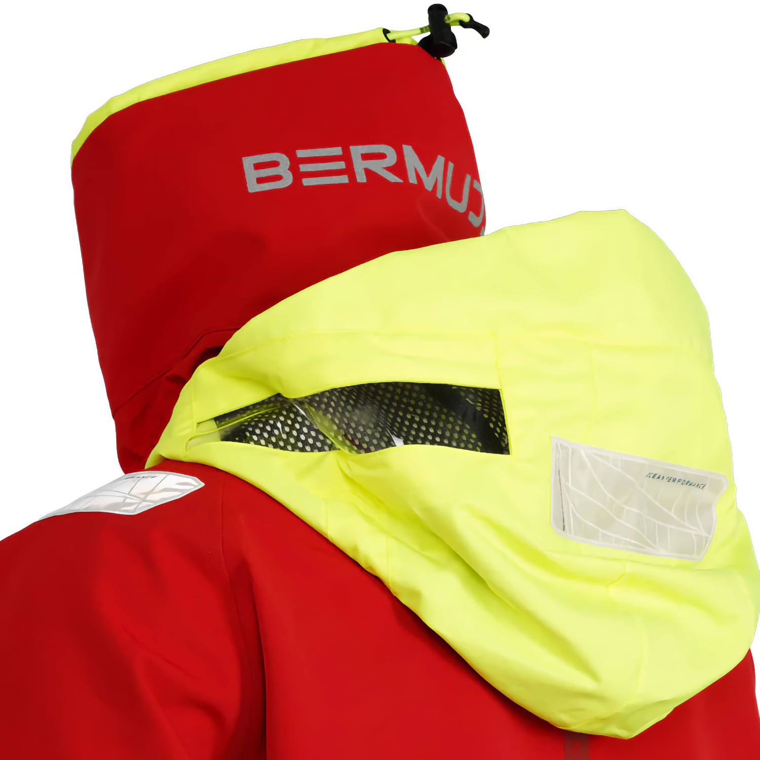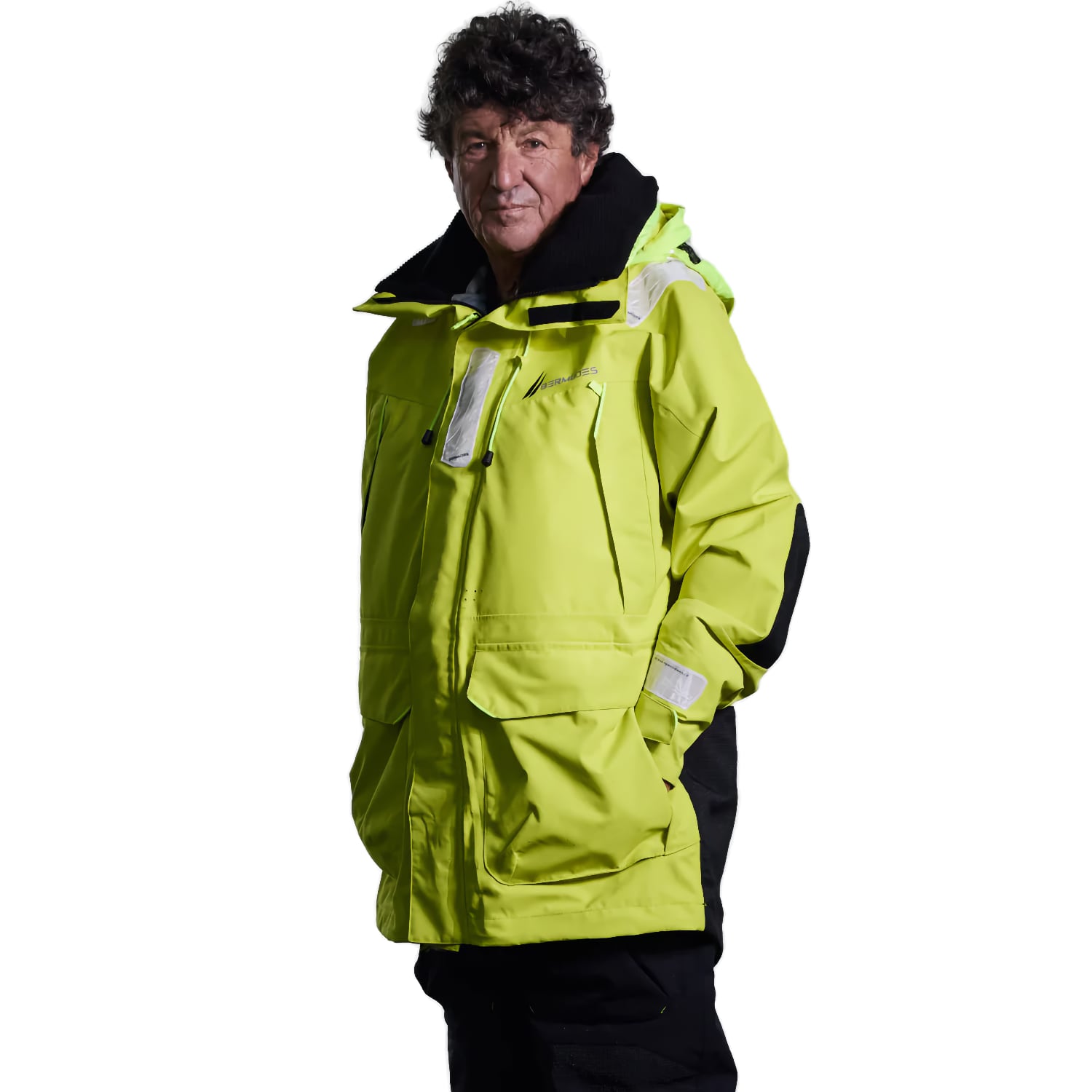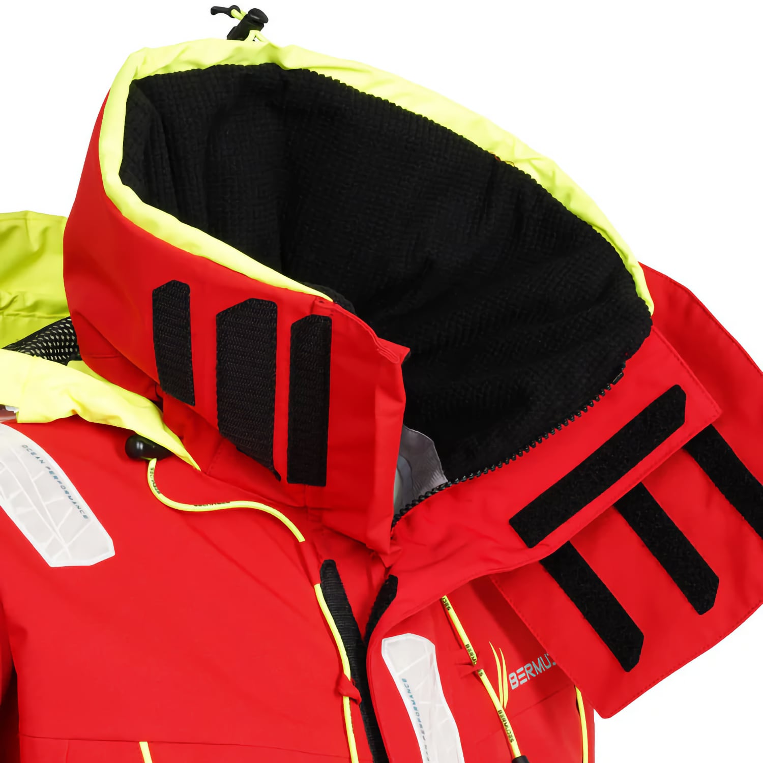 Cette veste de quart hauturière Bermudes est conçue pour les professionnels exposés aux conditions marines les plus exigeantes. Sa structure trois couches associe une membrane imperméable et respirante (20 000 mm/20 000 g/m²/24h) à un tissu extérieur en polyester recyclé issu de bouteilles plastiques. Le traitement déperlant DWR améliore la résistance à l’eau de surface. Les coutures sont étanchées et protégées par un double rabat tempête avec tunnel de drainage. Les poignets sont munis de manchons en néoprène limitant les infiltrations. La capuche attenante, réglable et repliable, est dotée de fenêtres latérales pour une meilleure visibilité périphérique. Le col montant de 21 cm, doublé polaire, ajoute une barrière thermique. La veste comporte des renforts résistants à l’abrasion sur les coudes et le bas de veste. Elle comprend sept poches, dont six chauffe-mains, deux poches zippées au thorax et deux poches à rabat. Deux points d’accroche sont prévus pour un gilet autogonflant.